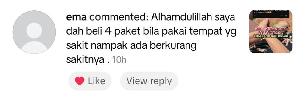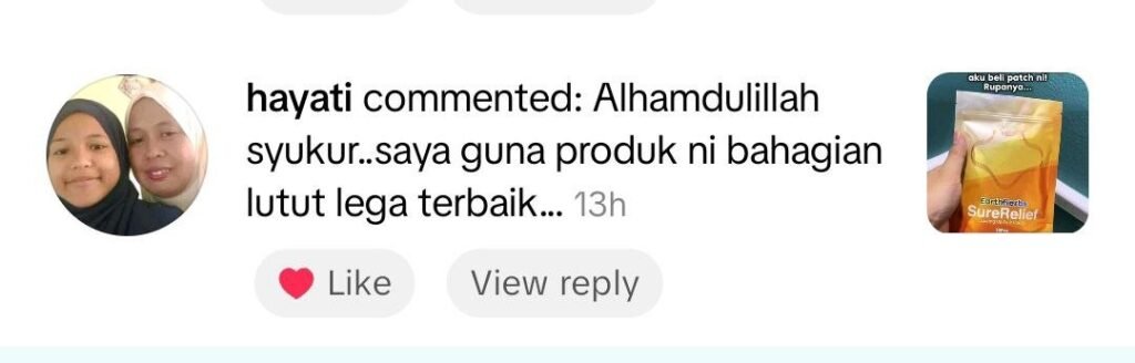 “Alhamdulillah sakit lutut dah kurang selepas amalkan SureRelief ni 2 malam..”