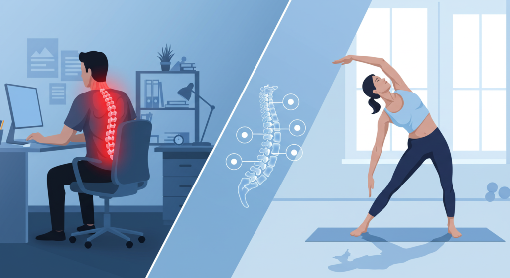 Tekanan pada tulang belakang adalah salah satu punca utama sakit pinggang akibat gaya hidup sedentari. Duduk terlalu lama, terutamanya dengan postur yang tidak betul, boleh meningkatkan tekanan pada cakera intervertebral, menyebabkan ketegangan otot serta kesakitan yang berpanjangan. Contohnya, seseorang yang duduk membongkok di hadapan komputer sepanjang hari mungkin akan mengalami sakit pinggang pada waktu petang kerana beban berlebihan yang dikenakan ke atas bahagian belakang. Tekanan ini juga boleh merebak ke lutut, kerana apabila seseorang duduk dalam tempoh yang lama tanpa bergerak, sendi lutut menjadi kaku dan sukar untuk berfungsi dengan baik, meningkatkan risiko sakit lutut.