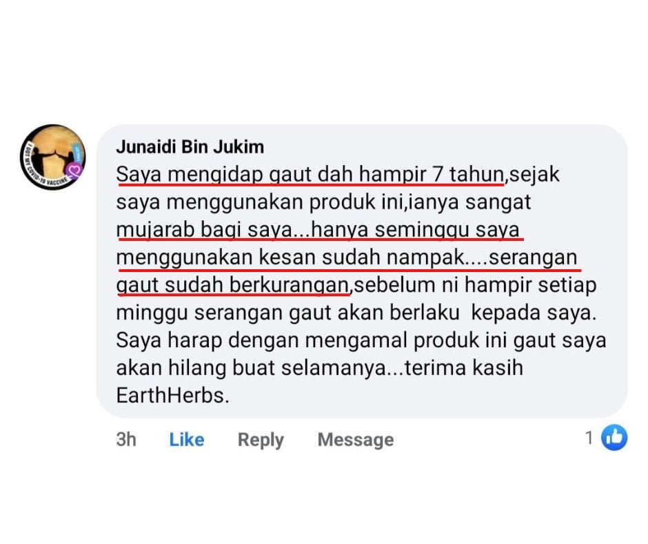 “Alhamdulillah gout pun dah hilang selepas amalkan Gel EARTHHERBS ni..”