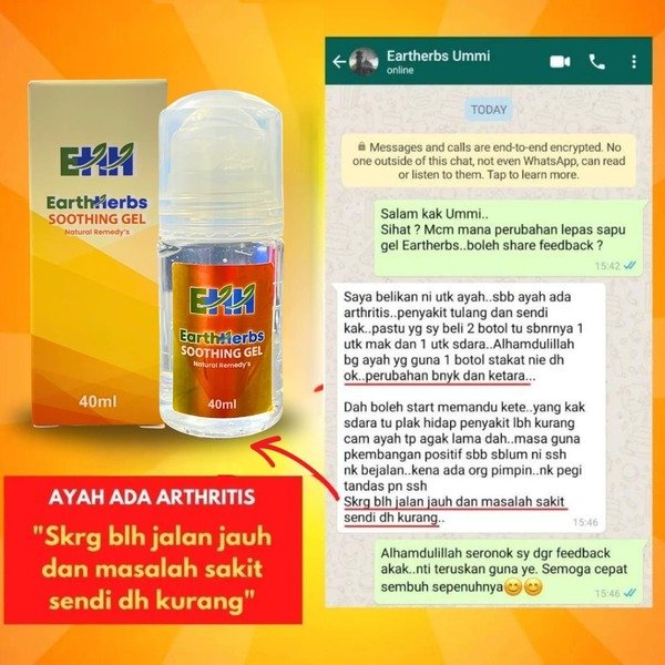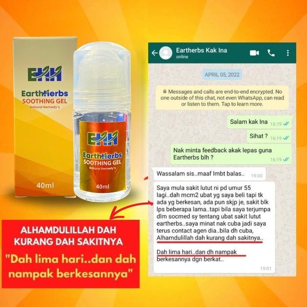 “Alhamdulillah sakit lutut dan semakin kurang selepas 5 hari amalkan Gel EARTHHERBS ni..”